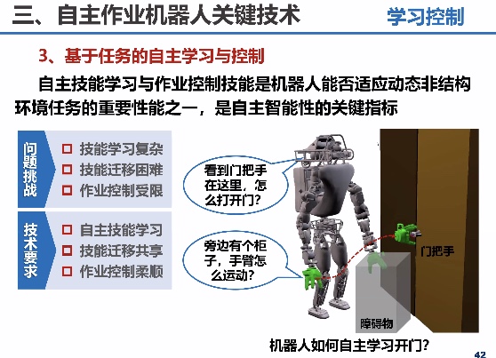 此次报告的题目为“智能自主作业机器人关键技术及发展趋势”,主要介绍了智能自主作业机器人作为一种兼具智能自主能力与主动作业能力的机器人系统,其在工业智能制造、精准农业、国防军事、太空探索等领域具有广泛的应用。报告从研究背景与意义、研究现状与面临挑战、关键技术等方面介绍自主作业机器人的现实发展与未来趋势。首先,以社会需求和学科特点阐述自主作业机器人研究的背景意义与面临的挑战性问题;其次介绍了目前自主作业机器人总体技术路线与关键科学问题,包括机构设计、环境感知、自主学习控制等方面;最后介绍了自主作业机器人未来的发展趋势与展望。